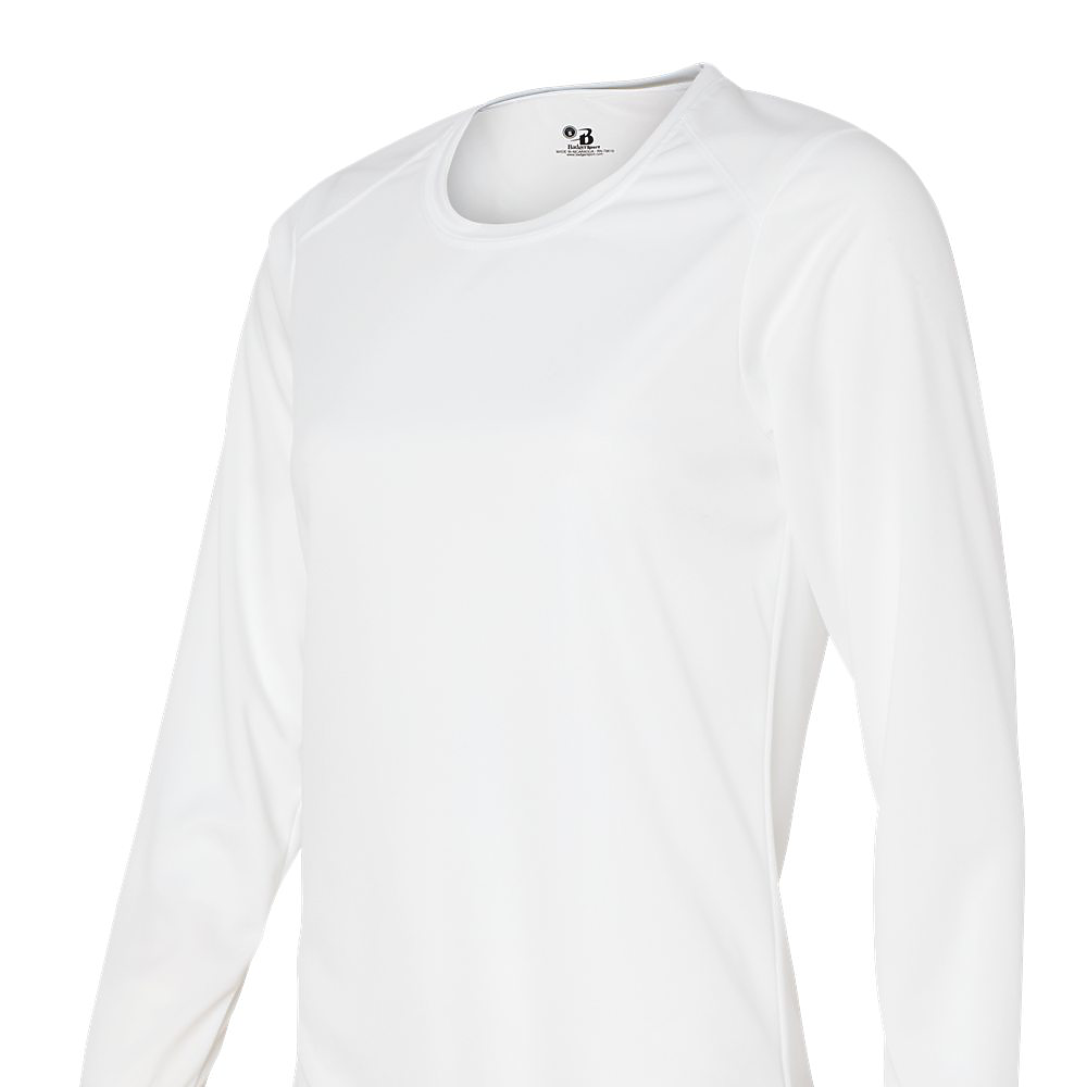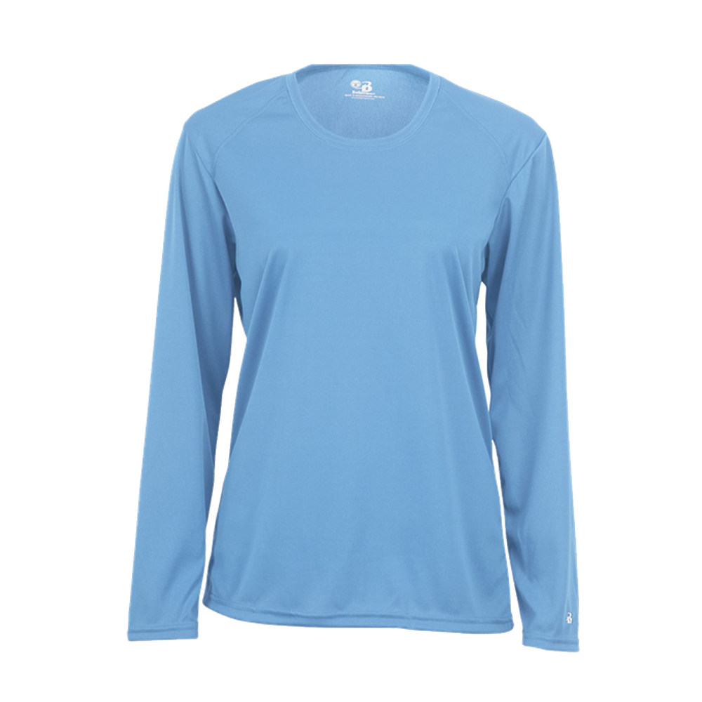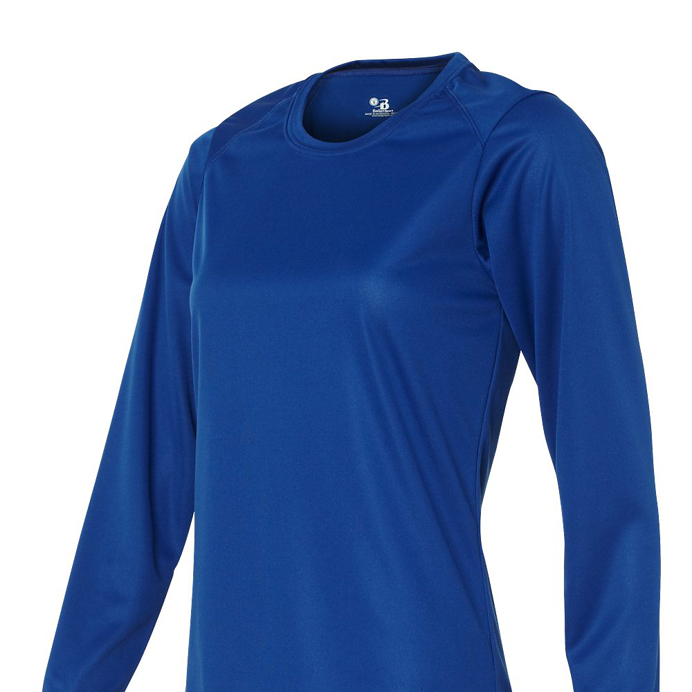 Badger Ladies Core L/S T-shirt. 100% Polyester moisture management/antimicrobial performance fabric with self-fabric collar. Double needle hem with tack and Badger heat transfer logo on left sleeve cuff.