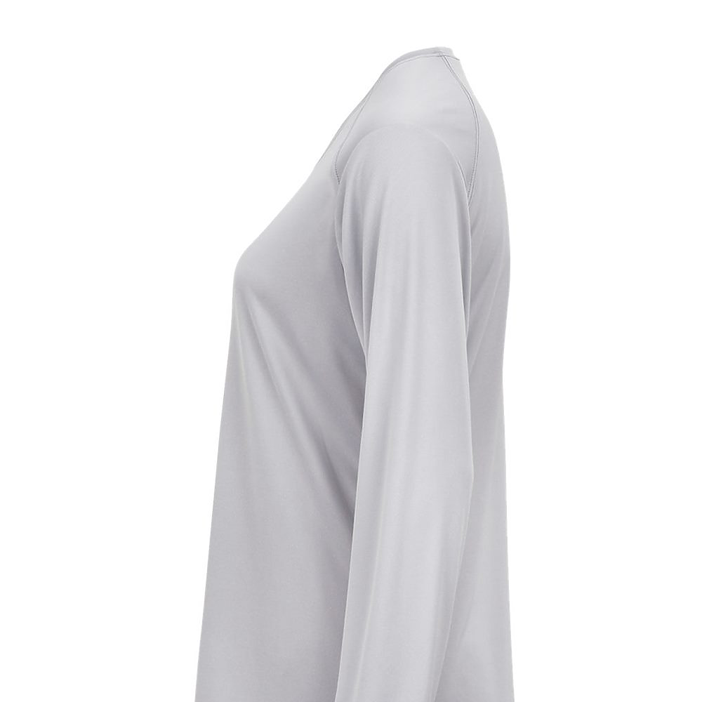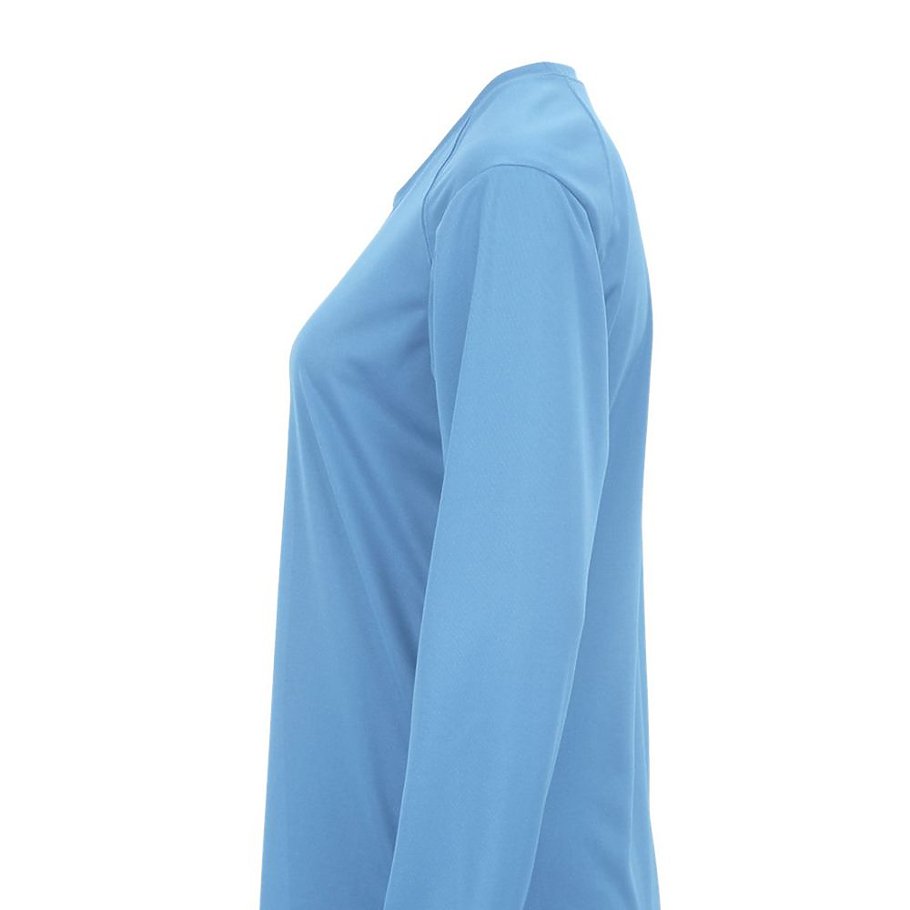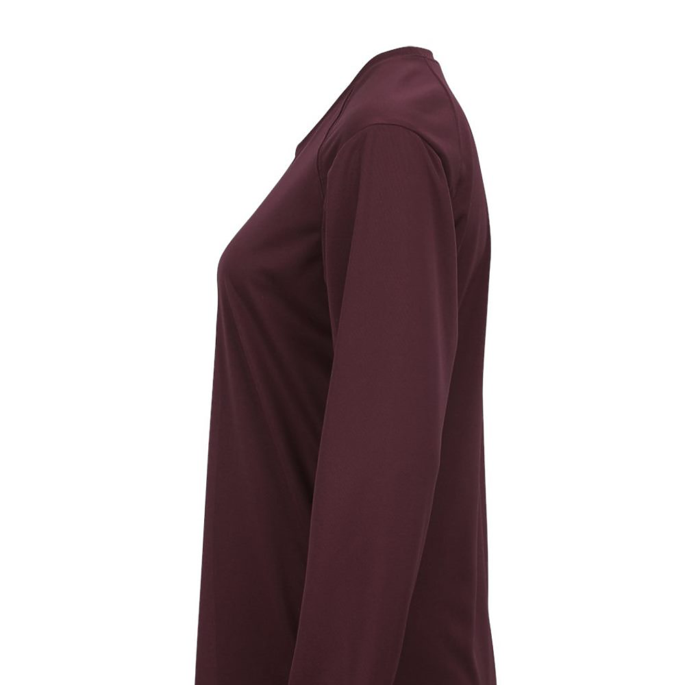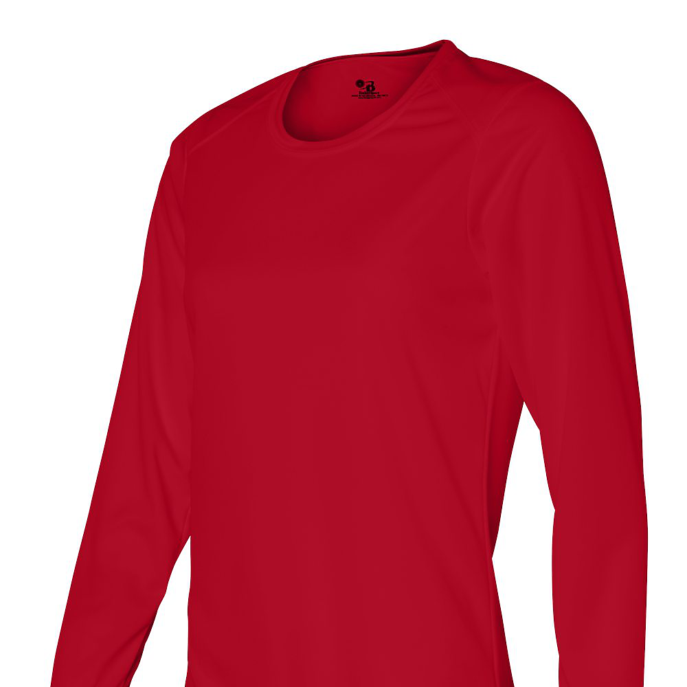 Badger Ladies Core L/S T-shirt. 100% Polyester moisture management/antimicrobial performance fabric with self-fabric collar. Double needle hem with tack and Badger heat transfer logo on left sleeve cuff.
