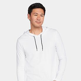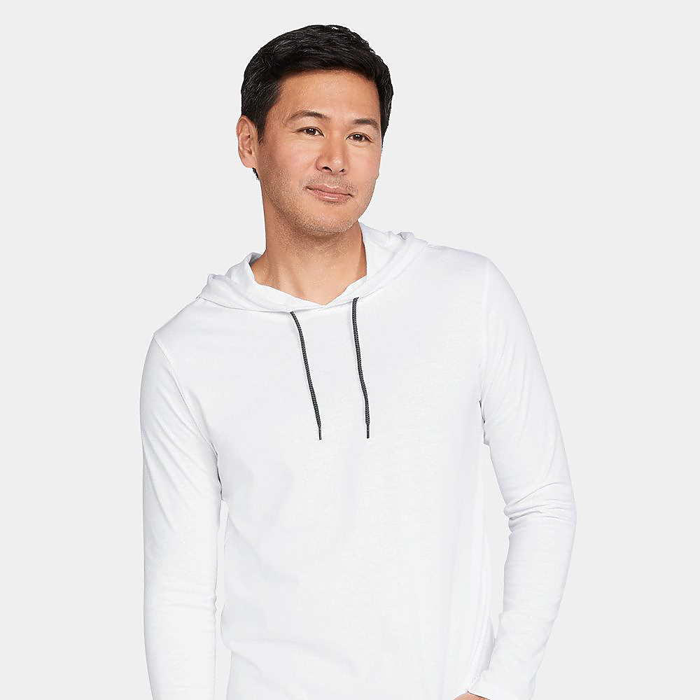 Gildan Adult 4.5 Ounce Softstyle Lightweight Long Sleeve Hooded T-Shirt. 4.5 ounce 100% pre-shrunk ring spun cotton. Modern Classic Fit, side seamed body. Heather colors 65/35 polyester/ring spun cotton. Relaxed unlined hood with contrast drawcord. Tear away label.