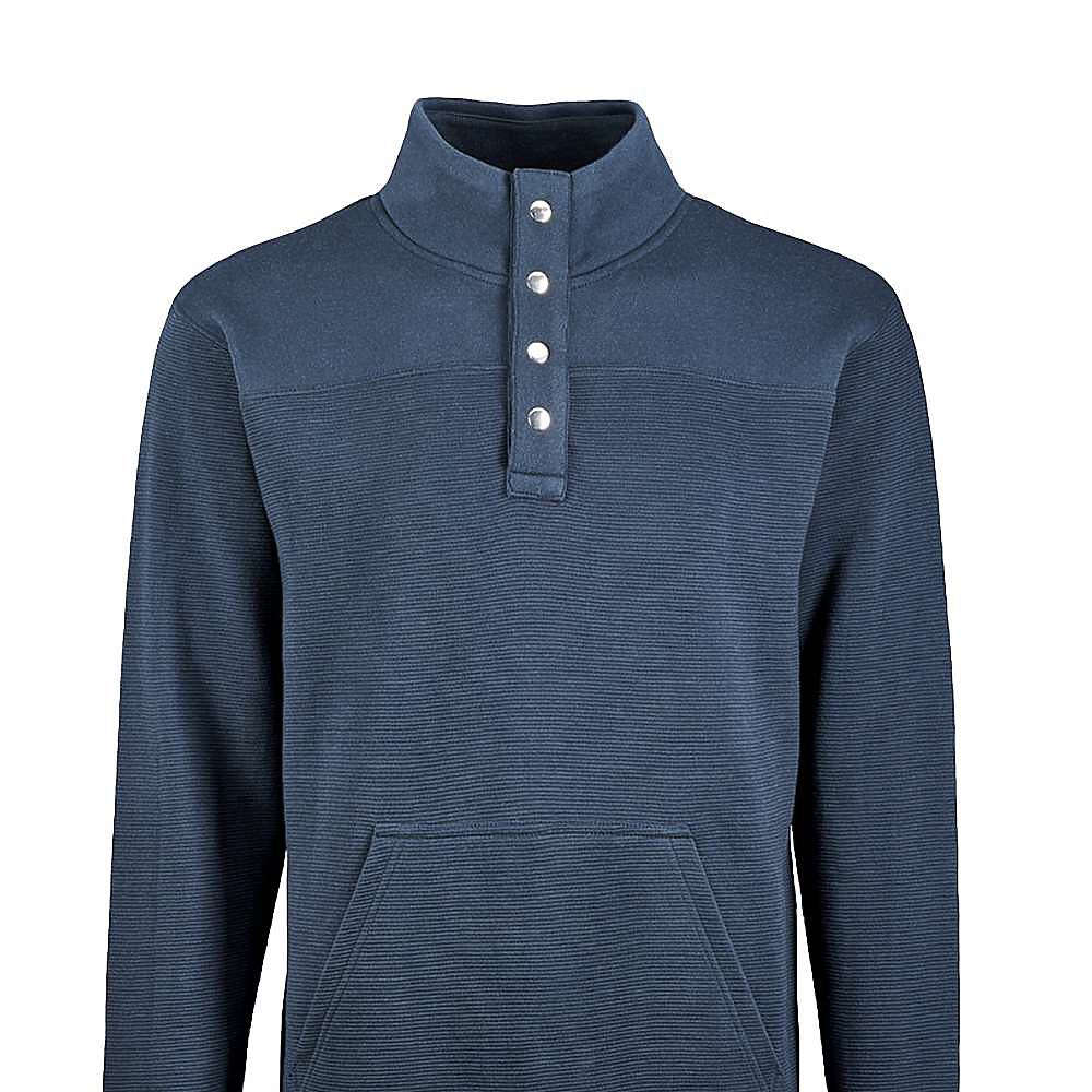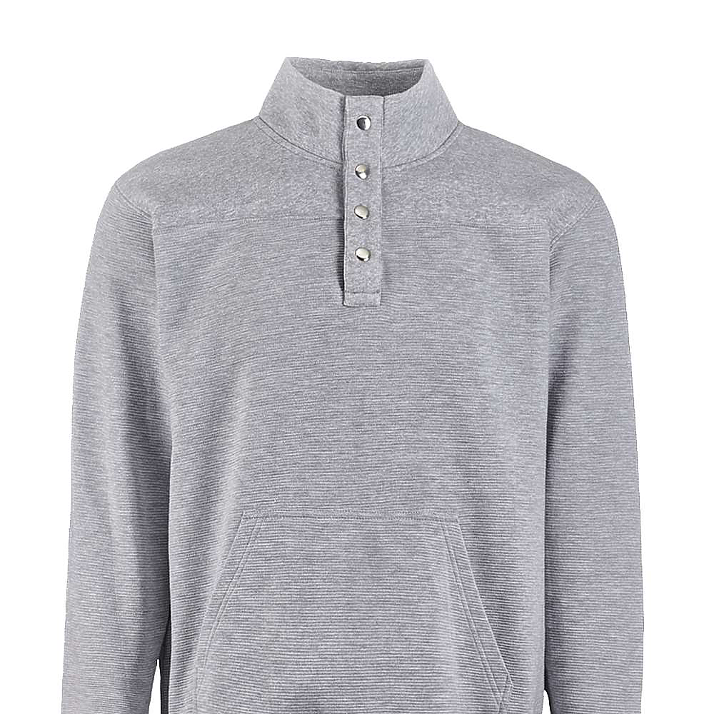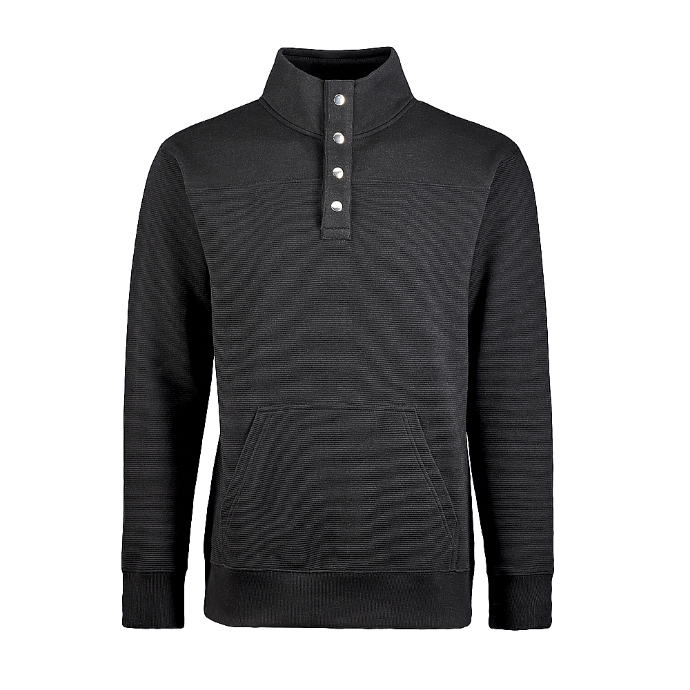 J-America Adult Ripple Fleece Snap Pullover. 8.25 ounce 55/45% cotton/poly knit ottoman fleece fabric. Horizontal texture. Solid air-spun fleece yoke and collar. Metal snap placket.